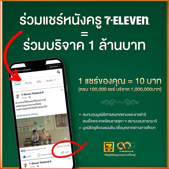 นอกจากนี้ ซีพี ออลล์ และ เซเว่น อีเลฟเว่น ขอเชิญชวนคนไทยทุกคนรับชมภาพยนตร์ “เชิดชูจิตวิญญาณความเป็นครู” ผ่านทางเฟสบุ๊ค 7-Eleven Thailand พร้อมเชิญร่วมแชร์ภาพยนตร์ โดย 1 แชร์ มีค่าเท่ากับ 10 บาท ครบ 100,000 แชร์ ซีพี ออลล์ และ เซเว่น อีเลฟเว่น มอบ 1 ล้านบาท ให้กับมูลนิธิเทคโนโลยีสารสนเทศตามพระราชดำริสมเด็จพระเทพรัตนราชสุดาฯ สยามบรมราชกุมารี และ มูลนิธิครูดีของแผ่นดิน เพื่อนำไปสนับสนุนภารกิจของทางมูลนิธิฯ ตามปณิธาน "Giving & Sharing" ของซีพี ออลล์ ต่อไป