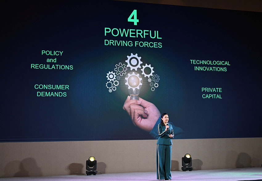 นางสาวขัตติยา อินทรวิชัย ประธานเจ้าหน้าที่บริหาร ธนาคารกสิกรไทย กล่าวว่า “ปัจจัยที่กระตุ้นให้เกิดการเปลี่ยนแปลงไปสู่ความยั่งยืน ประกอบด้วย 4 แรงขับเคลื่อนสำคัญ ได้แก่ การกำหนดนโยบายและกฎเกณฑ์จากภาครัฐ การเปลี่ยนแปลงพฤติกรรมของผู้บริโภค ความก้าวหน้าของเทคโนโลยีและนวัตกรรม และการเลือกลงทุนของนักลงทุน แต่ละภาคส่วนล้วนมีบทบาทที่แตกต่างกันในการผลักดันให้เกิดการเปลี่ยนแปลง และต้องอาศัยความร่วมมือจึงจะบรรลุเป้าหมายในการขับเคลื่อนประเทศไทยเพื่อก้าวไปสู่เศรษฐกิจที่ยั่งยืนได้อย่างแท้จริง ในฐานะสถาบันการเงิน ธนาคารกสิกรไทยมุ่งมั่นที่จะเปลี่ยนแปลงประเทศไทยเพื่อก้าวสู่ Net Zero อย่างจริงจัง ซึ่งสอดคล้องกับวัตถุประสงค์ในการจัดงานเสวนาในครั้งนี้ ที่เชื่อมโยงทุกภาคส่วนเข้าด้วยกัน เพื่อร่วมกันผลักดันการเปลี่ยนแปลงให้เกิดขึ้นจริง”