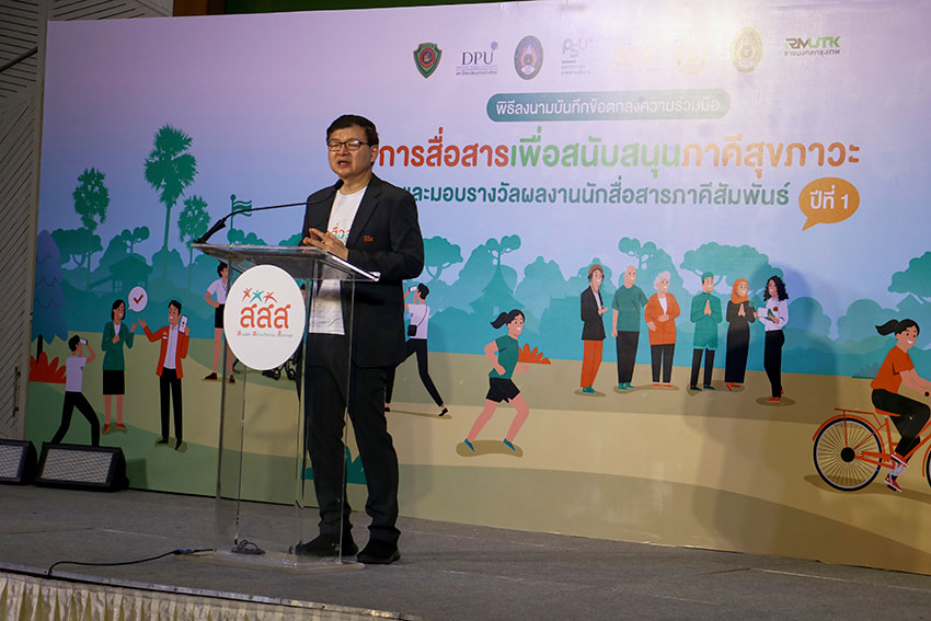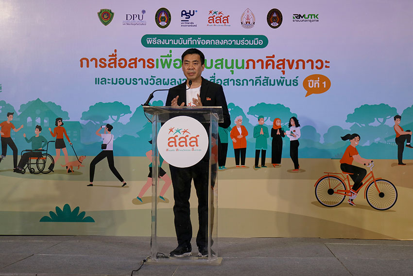 เมื่อเร็วๆ นี้ ที่ อาคารศูนย์เรียนรู้สุขภาวะ สำนักงานกองทุนสนับสนุนการสร้างเสริมสุขภาพ (สสส.) โดยสำนักพัฒนาภาคีสัมพันธ์และวิเทศสัมพันธ์ ร่วมกับ 7 สถาบันการศึกษาทุกภูมิภาค ได้แก่ ม.สงขลานครินทร์ วิทยาเขตปัตตานี ม.นครพนม ม.ราชภัฏอุตรดิตถ์ ม.ราชภัฏราชนครินทร์ฉะเชิงเทรา ม.ธุรกิจบัณฑิตย์ ม.เทคโนโลยีราชมงคลกรุงเทพ และวิทยาลัยเทคโนโลยีบริหารธุรกิจสมุทรปราการ จัด “พิธีลงนามบันทึกข้อตกลงความร่วมมือการสื่อสารเพื่อสนับสนุนภาคีสุขภาวะ และมอบรางวัลผลงานนักสื่อสารภาคีสัมพันธ์ ปีที่ 1”
