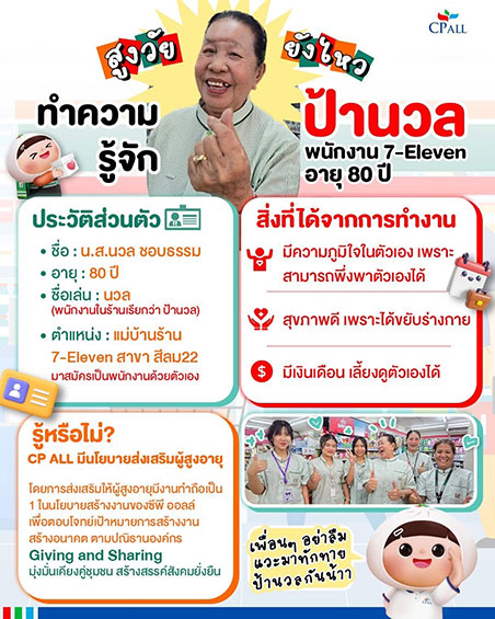 ประเทศไทย ได้ก้าวเข้าสู่ ‘สังคมผู้สูงอายุโดยสมบูรณ์’ (Complete Aged Society) ตั้งแต่ปี 2565 ซีพี ออลล์-เซเว่น อีเลฟเว่น ในฐานะภาคเอกชนไทยที่มีความมุ่งมั่นในปณิธาน "Giving and Sharing" จึงได้เดินหน้านโยบายสร้างงาน “ผู้สูงอายุ” เพื่อส่งเสริมให้ผู้สูงอายุมีอาชีพ มีรายได้ มีคุณค่า มีคุณภาพชีวิตที่ดีขึ้น