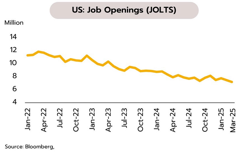 แม้ว่าตัวเลขการจ้างงานจะออกมาดีกว่าคาด แต่ข้อมูลเศรษฐกิจอื่นๆ เช่น ความเชื่อมั่นผู้บริโภค การบริโภคภาคเอกชน PMI ภาคการผลิตและภาคบริการ รวมถึงตำแหน่งงานว่างเปิดใหม่ ยังคงบ่งชี้ถึงการชะลอตัวทางเศรษฐกิจที่ชัดเจน และสอดคล้องกับ GDP ในไตรมาส 1 ที่หดตัวลง -0.3% QoQ annualized ซึ่งไม่เพียงเป็นผลจากการเร่งนำเข้าล่วงหน้าเพื่อหลีกเลี่ยงผลกระทบด้านราคาจากปรับขึ้นภาษีศุลกากร แต่ยังเป็นผลจากการชะลอตัวของเศรษฐกิจในวงกว้างโดยเฉพาะการบริโภคที่เติบโตต่ำสุดในรอบ 7 ไตรมาส ด้วยเหตุนี้ วิจัยกรุงศรีคาดว่าธนาคารกลางสหรัฐฯ (เฟด) จะเริ่มลดดอกเบี้ยตั้งแต่กลางปีนี้ และมีแนวโน้มปรับลดสู่ระดับ 3.50–3.75% ภายในสิ้นปี เพื่อพยุงเศรษฐกิจและผ่อนคลายภาวะการเงินในระยะข้างหน้า