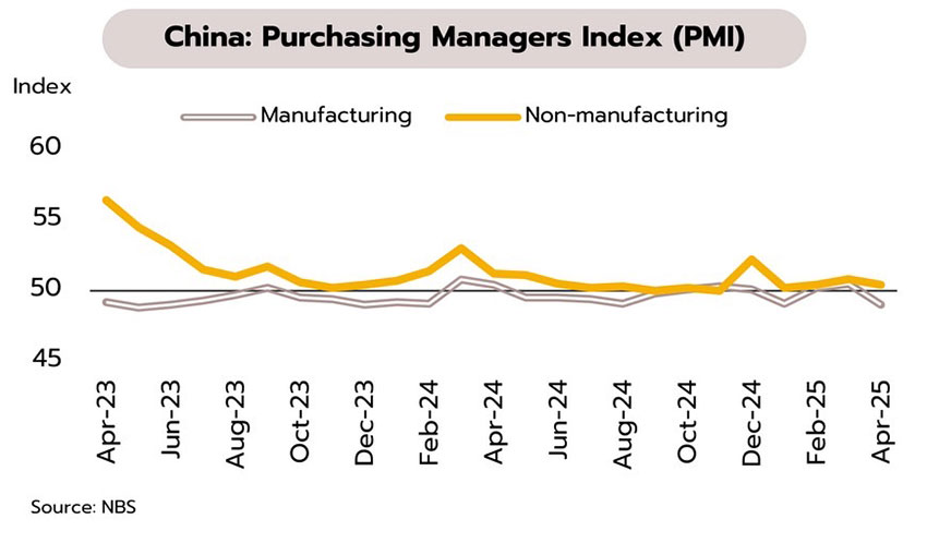 เศรษฐกิจจีนเริ่มได้รับผลกระทบจากสงครามการค้า ขณะที่ทิศทางการฟื้นตัวของภาคอสังหาริมทรัพย์ยังไม่ชัดเจน ทางการ (NBS) รายงานตัวเลข PMI ภาคการผลิตพลิกกลับมาหดตัวจาก 50.5 ในเดือนมีนาคมเป็น 49 ในเดือนเมษายน ซึ่งต่ำที่สุดนับตั้งแต่เดือนธันวาคม 2566 เช่นเดียวกับดัชนีย่อยคำสั่งซื้อใหม่เพื่อการส่งออก ซึ่งหดตัวลงสู่ระดับต่ำสุดในรอบกว่า 2 ปี จาก 49 เป็น 44.7 ส่วนดัชนี PMI นอกภาคการผลิตชะลอลงจาก 50.8 เป็น 50.4 ขณะที่ยอดขายบ้านใหม่ของผู้พัฒนาอสังหาฯ 100 อันดับแรกหดตัวชะลอลงจาก -11.4% YoY เป็น -8.7%