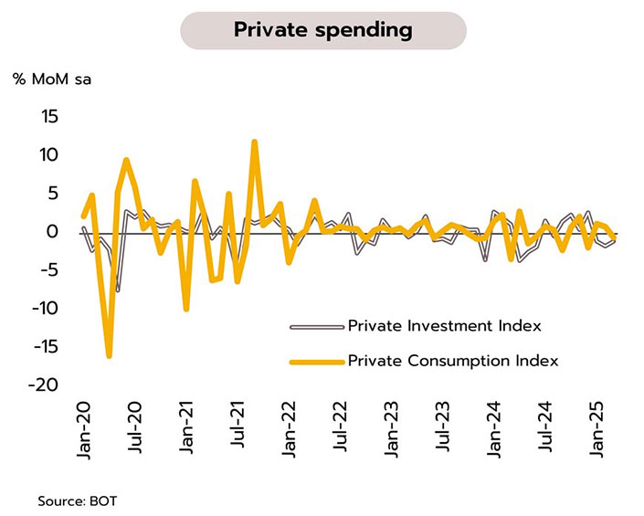 เศรษฐกิจชะลอลงในเดือนมีนาคมจากการบริโภค การลงทุน และการท่องเที่ยว หลายสถาบันทยอยปรับลดคาดการณ์ GDP ปีนี้ลงใกล้ระดับ 2% ธนาคารแห่งประเทศไทย (ธปท.) รายงานภาพรวมเศรษฐกิจในเดือนมีนาคมชะลอลงจากเดือนก่อน ตามการบริโภคภาคเอกชนที่ปรับลดลงในทุกหมวด (-0.5% MoM sa) โดยเฉพาะในหมวดบริการที่ลดลงจากกลุ่มโรงแรมและภัตตาคารเป็นสำคัญ สอดคล้องกับจำนวนนักท่องเที่ยวทั้งไทยและต่างชาติที่ลดลง ด้านการลงทุนภาคเอกชนปรับลดลงต่อเนื่อง (-1.0% MoM sa) โดยปรับลดลงในหมวดเครื่องจักรและอุปกรณ์ และหมวดยานพาหนะเป็นสำคัญ ขณที่การลงทุนในหมวดก่อสร้างทรงตัว สำหรับการส่งออกหากหักทองคำและขจัดปัจจัยฤดูกาลแล้วลดลงจากเดือนก่อนเช่นกัน (-0.2% mom sa)
