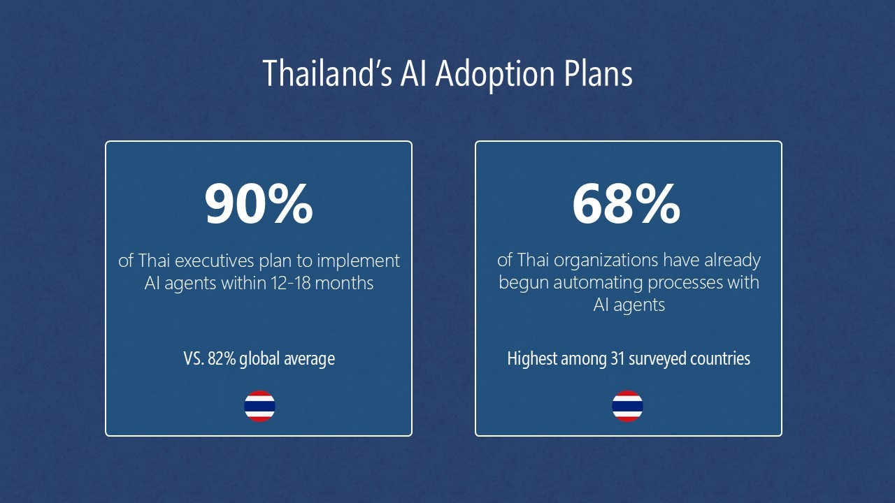 ผลสำรวจเผยว่าผู้บริหารในประเทศไทยกว่า 90% (ค่าเฉลี่ยทั่วโลก 82%) มีแผนที่จะนำ AI agent เข้ามาทำงานเคียงข้างพนักงานในช่วง 12-18 เดือนข้างหน้า เนื่องจาก AI agent สามารถทำความเข้าใจในเนื้องาน วางแผนงาน และทำงานบางส่วนโดยอัตโนมัติด้วยตัวเอง โดยมีพนักงานเป็นผู้ดูแลและตรวจสอบความถูกต้องในขั้นตอนที่สำคัญ หรือเท่ากับว่ามีแผนที่จะขยายองค์กรด้วย “ทีมงานดิจิทัล” ผ่าน AI นั่นเอง