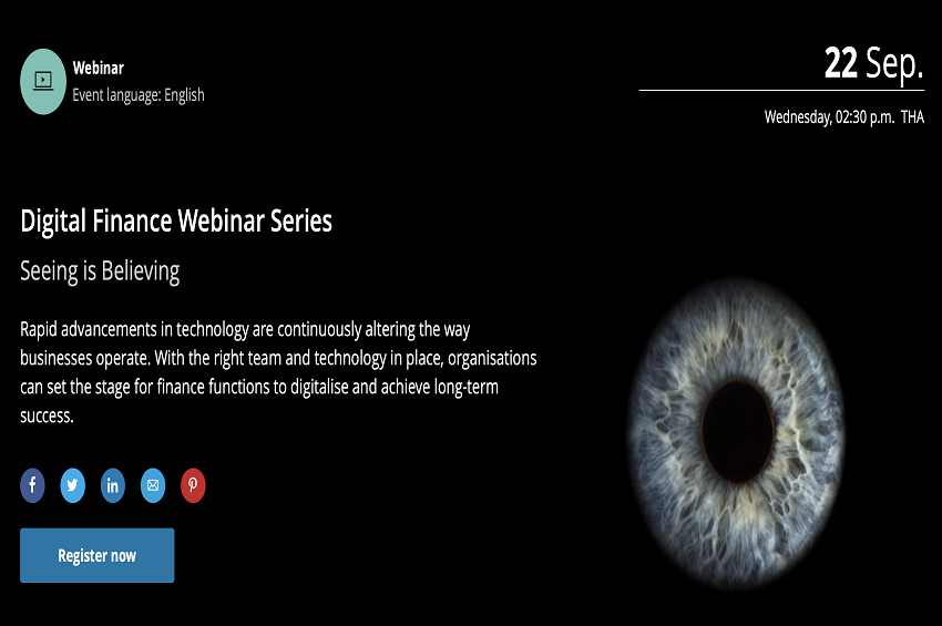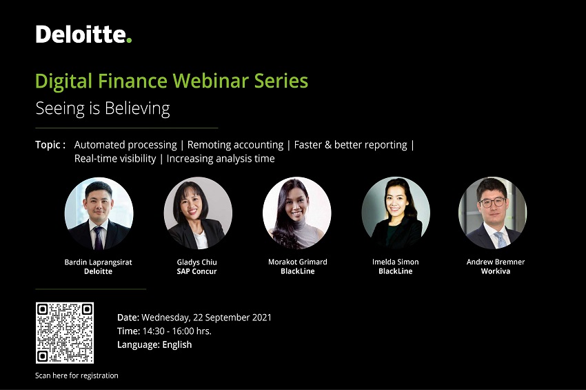 ดีลอยท์ ประเทศไทยได้จัดสัมมนา “Digital Finance webinar “Seeing is Believing” ในวันที่ 22 กันยายน 2564สามารถดูข้อมูลเพิ่มเติมได้ ที่นี่