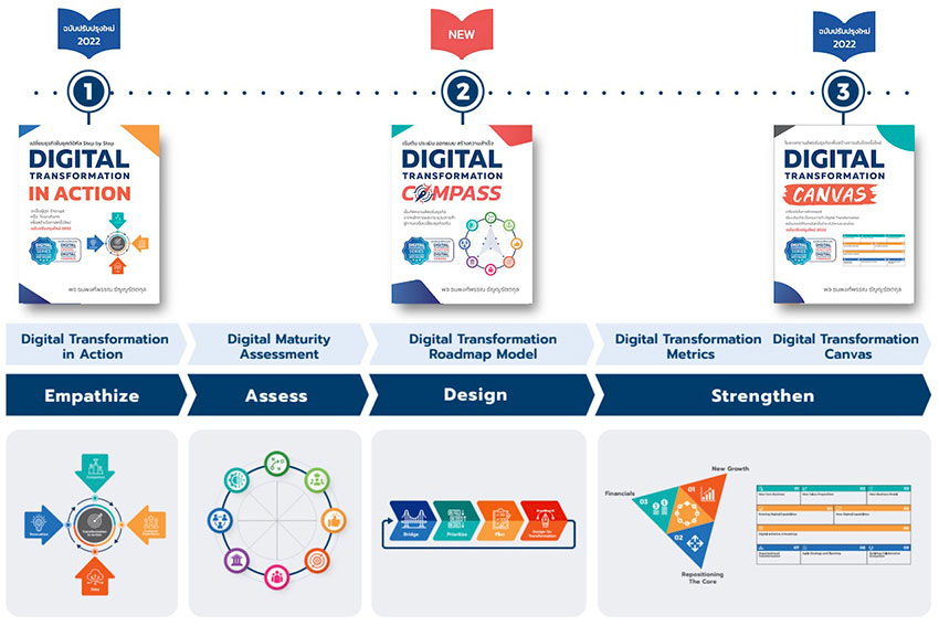 หนังสือชุด Digital Transformation ทั้งหมดมีอยู่ 3 เล่ม เล่มแรก Digital Transformation In Action กล่าวถึงหลักการทั้ง 5 เพื่อสร้างการเข้าใจว่า 1. การแข่งขันเปลี่ยนไป เราจะเปลี่ยนแปลงองค์กรของเราอย่างไร 2. เมื่อผู้บริโภคเปลี่ยนไป การตลาดจะต้องเปลี่ยนตาม เราจะสร้างประสบการณ์ที่ดี ให้แก่ผู้บริโภคในยุคดิจิทัลได้อย่างไร 3. คือการเริ่มต้นการตั้งหลัก Transform ซึ่งข้อมูลหรือ Data เป็นจุดเริ่มต้นของการทำ Digital Transformation 4. การสร้างนวัตกรรม เมื่อเราเริ่ม Transformation ด้วย Data ได้แล้ว เราจึงสร้างนวัตกรรม หรือ Innovation ให้เกิดขึ้นได้จริงในองค์กร ซึ่งทั้ง 4 หลักการนี้ คือปัจจัยภายนอกที่มีผลต่อปัจจัยภายใน ส่งผลต่อการเปลี่ยนแปลง