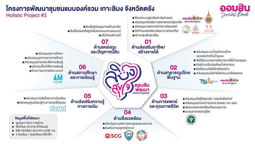 นายวิทัย รัตนากร ผู้อำนวยการธนาคารออมสิน เปิดเผยว่า จากผลสำเร็จโครงการพัฒนาชุมชนแบบองค์รวม (Holistic Area-Based Community Development) โปรเจกต์ต้นแบบ “ออมสินฮ่วมใจฮักขุนน่าน” อำเภอเฉลิมพระเกียรติ จังหวัดน่าน ที่สามารถยกระดับคุณภาพชีวิตแก่สมาชิกชุมชนในโครงการ ครอบคลุมการพัฒนา 10 มิติ อาทิ ด้านอาชีพ รายได้ เงินออม สุขภาพ การศึกษา เป็นกรณีตัวอย่างการดำเนินงานที่สะท้อนผลลัพธ์เชิงบวกต่อสังคม (Social Impact) ที่เป็นรูปธรรม ธนาคารจึงเดินหน้าต่อยอดแนวคิดการพัฒนาชุมชนแบบองค์รวมไปยังพื้นที่เป้าหมายอื่น เพื่อขยายผลการสร้าง Social Impact โดยได้คัดเลือกพื้นที่เกาะลิบง อำเภอกันตัง จังหวัดตรัง เป็นพื้นที่พัฒนาต่อไป ภายใต้ชื่อโครงการ “ลิบงสุขใจ ออมสินพัฒนา”