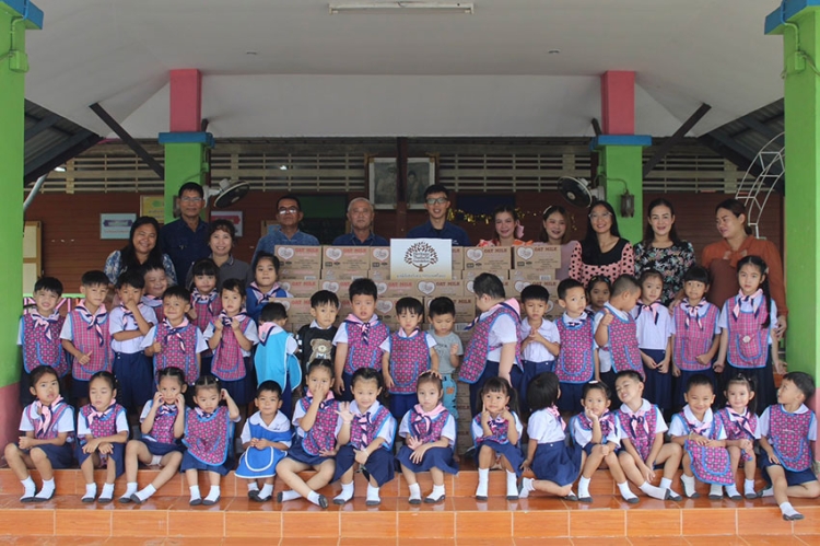 นอกจากนี้ ยังได้ส่งมอบผลิตภัณฑ์ให้กับโรงเรียนเทศบาลวัดหัวข่วง โดยมี นางทองมัน สิทธิกัน ผู้อำนวยการโรงเรียนเทศบาลวัดหัวข่วง (แถวบนสุด คนที่ 5 จากซ้าย) เป็นผู้รับมอบ เพื่อบรรเทาความเดือดร้อนและสร้างกำลังใจให้แก่เด็กนักเรียน ครู และบุคลากร ในช่วงฟื้นฟูหลังเหตุการณ์น้ำท่วม