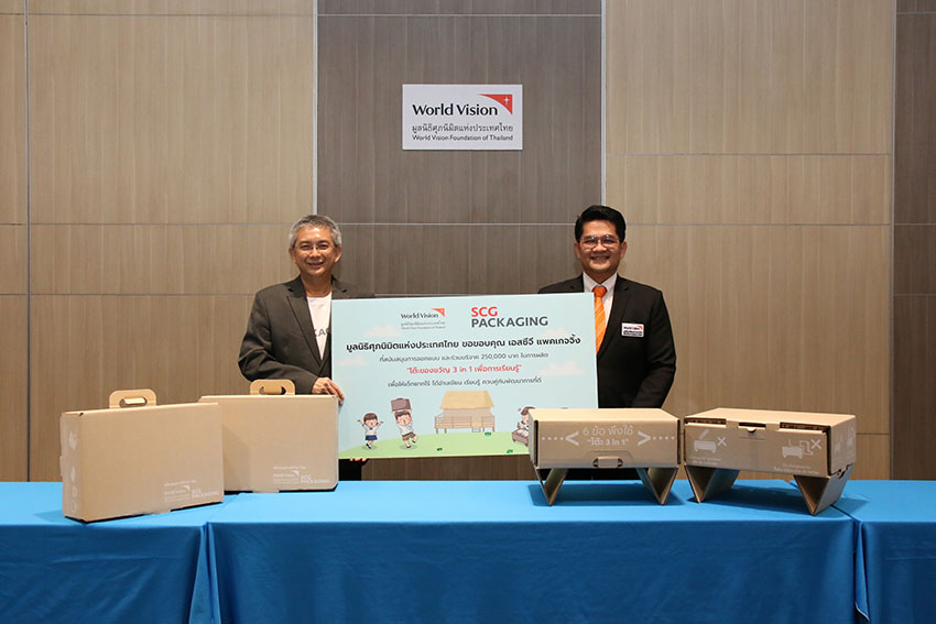 ทำให้เด็กต้องนั่งก้มตัวอ่านหนังสือหรือนอนราบกับพื้นเพื่อเขียนหนังสือเป็นประจำ ซึ่งอาจส่งผลกระทบต่อสุขภาพและสรีระของเด็กในอนาคต เช่น มีอาการปวดหลัง ปวดคอ และส่งผลเสียต่อสายตาได้ มูลนิธิศุภนิมิตแห่งประเทศไทย จึงร่วมกับ เอสซีจี แพคเกจจิ้ง ออกแบบและผลิตโต๊ะกระดาษ 3 in 1 เพื่อส่งมอบให้เด็ก ๆ ได้ใช้โต๊ะเรียนที่เหมาะสมเพื่อป้องกันการนั่งที่ผิดหลักการยศาสตร์อันจะส่งผลต่อสุขภาพในระยะยาว โดยเมื่อเร็วๆ นี้ คุณสุชัย กอประเสริฐศรี ประธานเจ้าหน้าที่ปฏิบัติการ กิจการบรรจุภัณฑ์กระดาษ เอสซีจี แพคเกจจิ้ง ร่วมมอบ “โต๊ะกระดาษ 3 in 1 เพื่อการเรียนรู้” จำนวน 25,000 ชุด ให้แก่ ดร.สราวุธ ราชศรีเมือง ผู้อำนวยการมูลนิธิศุภนิมิตแห่งประเทศไทย เพื่อนำไปมอบให้แก่นักเรียนในพื้นที่ชนบทในเครือข่ายของมูลนิธิศุภนิมิตฯ ทั่วประเทศ