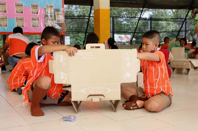 ดิเรกข์ อินสกุล นักออกแบบ เอสซีจี แพคเกจจิ้ง กล่าวว่า “โจทย์สำคัญของมูลนิธิศุภนิมิตฯ คือการออกแบบโต๊ะที่น้ำหนักเบา พกพาง่าย และใช้งานได้หลากหลาย เราจึงเลือกใช้กระดาษ มาพัฒนารูปแบบให้ตรงตามการใช้งานและเหมาะกับสรีระของเด็ก สามารถดัดแปลงได้หลายฟังก์ชั่น โดยเลือกใช้กระดาษลอนหนา คำนวณจุดรับแรงกดให้ดี เน้นความแข็งแรง และออกแบบโครงสร้างให้เด็กประกอบเองได้ ไม่ซับซ้อน ข้อดีอีกอย่าง คือ สามารถสอดแทรกการเรียนรู้ไว้ในตัว เหมือนกับปริศนาที่ให้เด็กได้ทดลองประกอบเป็นของใช้อย่างที่ตัวเองต้องการ และหลังจากใช้งานจนชำรุดแล้ว วัสดุกระดาษพวกนี้สามารถนำกลับมารีไซเคิล เข้าสู่กระบวนการผลิตใหม่ได้ง่าย ไม่ถูกทิ้งเป็นขยะ กระดาษจึงเป็นตัวเลือกที่เหมาะสมที่สุด และเราก็ดีใจที่เห็นว่าเด็ก ๆ สนุกกับการประกอบโต๊ะกระดาษและนำไปใช้งานได้จริง”