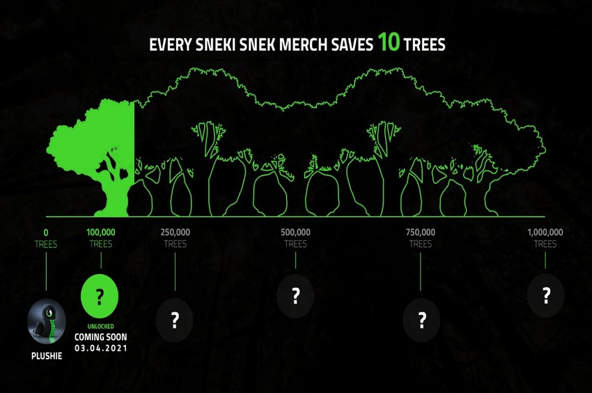 จนี้ Razer ขยายเป้าหมายโดยตั้งเป้าที่ จะปกป้องต้นไม้ทั้งหมด 1 ล้านต้น โดยมีอิเวนท์สำคัญระหว่างทางที่ จะได้เห็นสินค้าใหม่ของ Sneki Snek ที่จะวางจำหน่ายเมื่อบรรลุเป้ าหมายใหม่แต่ละครั้ง เพื่อเป็นการเฉลิมฉลองการบรรลุ เป้าหมาย 100,000 ต้นจะมีการประกาศสินค้าใหม่ของ Sneki Snek ในงาน RazerStore Live ในวันที่ 4 มีนาคมพร้อมกับการประกาศผลิตภั ณฑ์ที่น่าสนใจอื่น ๆ อีกมากมาย