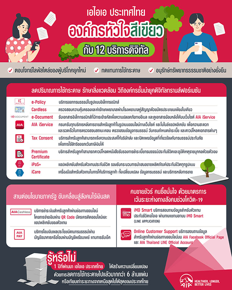 ที่ได้รับการออกแบบมาเพื่อตอบโจทย์ไลฟ์สไตล์ของผู้บริโภคยุคใหม่ ทดแทนการใช้กระดาษ ควบคู่ไปกับการอนุรักษ์ทรัพยากรธรรมชาติอย่างยั่งยืน โดยนับตั้งแต่มีการเปิดตัวบริการดังกล่าว ตลอดช่วงปีที่ผ่านมา เอไอเอ ประเทศไทย ได้สร้างความเปลี่ยนแปลงด้วยการลดการใช้กระดาษไปแล้วปริมาณมากกว่า 6 ล้านแผ่น หรือเทียบเท่าระยะทางจากเหนือสุดไปใต้สุดของประเทศไทย