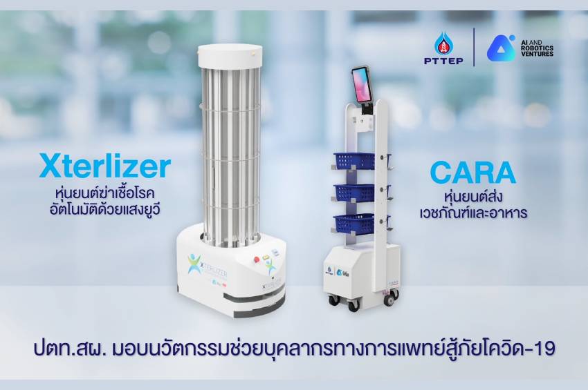 มอบหุ่นยนต์ “คาร่า” (CARA) ช่วยบุคลากรทางการแพทย์ในการนำส่งเวชภัณฑ์และอาหาร จำนวน 10 ตัว และ หุ่นยนต์ฆ่าเชื้อโรคอัตโนมัติด้วยแสงยูวี “เอ็กซ์เตอร์ไลเซอร์” (Xterlizer) พร้อมเงินสนับสนุน ให้กับโรงพยาบาลสนามครบวงจร ของกลุ่ม ปตท. ซึ่ง คาร่า และ เอ็กซ์เตอร์ไลเซอร์ เป็นนวัตกรรมที่ บริษัท เอไอ แอนด์ โรโบติกส์ เวนเจอร์ส จำกัด (เออาร์วี) บริษัทในเครือ ปตท.สผ. และพันธมิตร ร่วมกันพัฒนาขึ้น เพื่อช่วยอำนวยความสะดวก และลดความเสี่ยงในการติดเชื้อให้กับบุคลากรทางการแพทย์