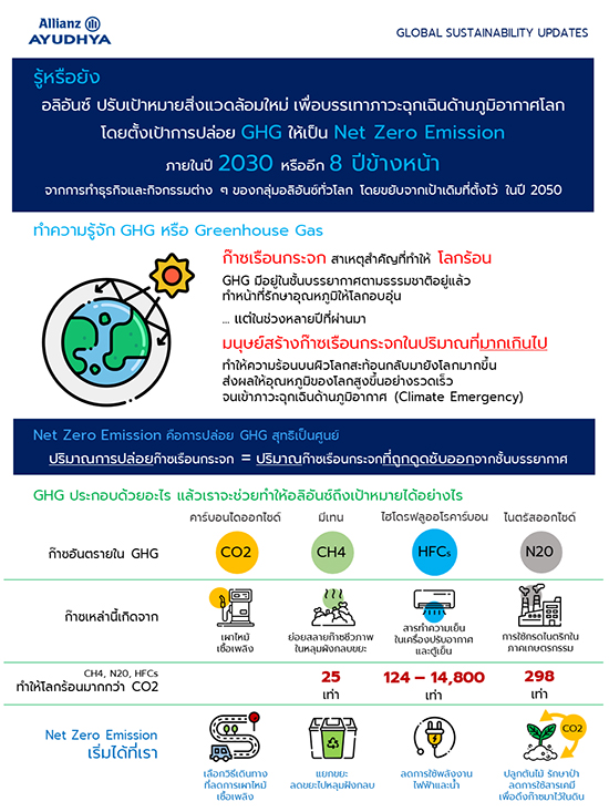ประกาศเป้าหมายใหม่สำหรับทั้งธุรกิจหลักและการดำเนินงานของบริษัทฯ โดยจะจำกัดการปล่อยก๊าซเรือนกระจกจากพื้นที่ที่บริษัทฯดำเนินกิจการและกิจกรรมในกว่า 70 ตลาดทั่วโลก ให้ปล่อยก๊าซเรือนกระจกสุทธิเป็นศูนย์ภายในปี 2573 โดยตั้งแต่วันที่ 1 มกราคม 2566 เป็นต้นไป ธุรกิจด้านการลงทุน และ การประกันวินาศภัย (Property & Casualty) ของอลิอันซ์ จะไม่ลงทุนหรือรับประกันการดำเนินกิจการแบบ single-site หรือ stand-alone บางประเภทที่เกี่ยวข้องกับความเสี่ยงด้านน้ำมันและก๊าซในอาร์คติกและแอนตาร์กติก หรือความเสี่ยงที่เกี่ยวข้องกับน้ำมันชนิดหนักมาก (extra heavy oil) และทะเลลึก โดยภายในต้นปี 2566 อลิอันซ์จะกำหนดให้ผู้ผลิตไฮโดรคาร์บอนขนาดใหญ่ ดำเนินการตามแผนการปล่อยก๊าซเรือนกระจกสุทธิเป็นศูนย์ภายในปี 2573 เพื่อใช้เป็นเงื่อนไขของการทำประกันและการลงทุน