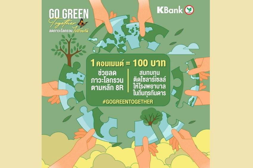ส่งเสริมการเปลี่ยนพฤติกรรม ที่จะสร้างคุณค่าที่ยิ่งใหญ่ร่วมกัน ด้วยการเปิดพื้นที่จัดกิจกรรมให้ทุกคนสามารถร่วมสนุกได้ง่าย ๆ เพียง 2 ขั้นตอน คือ 1) เขียนคอมเมนต์ใต้โพสต์แคมเปญในเฟซบุ๊ก KBank Live แนบภาพบอกเล่าไอเดียหรือวิธีการรักษาสิ่งแวดล้อม อย่างน้อย 1R พร้อมติดแฮชแทก #GOGREENTOGETHER 2) แชร์โพสต์เฟซบุ๊ก KBankLive ที่ให้ความรู้เรื่อง 8R และตั้งค่าเป็นสาธารณะ ทุก 1 คอมเมนต์ ธนาคารจะสนับสนุนเงิน 100 บาท รวมสูงสุด 1 ล้านบาท เพื่อเป็นทุนในการติดตั้งโซลาร์เซลล์ให้แก่โรงพยาบาลในถิ่นทุรกันดาร ซึ่งการต่อยอดครั้งนี้ นอกจากจะช่วยให้ทางโรงพยาบาลประหยัดต้นทุนเรื่องค่าไฟฟ้าแล้ว จะช่วยเพิ่มโอกาสให้แก่โรงพยาบาลในการนำงบประมาณที่มีอยู่ไปใช้ในการจัดหาอุปกรณ์ทางการแพทย์ที่จำเป็นได้มากขึ้น จึงเป็นการช่วยรักษาชีวิตคนไข้ทั้งเชิงปริมาณและคุณภาพ และสอดคล้องกับหลักการพัฒนาเพื่อความยั่งยืนทั้งเรื่องการสนับสนุนพลังงานสะอาดและการส่งเสริมความเป็นอยู่ที่ดีของทุกคน