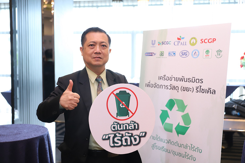 ขณะที่การขยายเครือข่ายไปยังฝั่งเอกชนในครั้งนี้ นับเป็นการรวบรวมผู้เกี่ยวข้องในระบบนิเวศการจัดการขยะเข้าด้วยกันอย่างครบวงจร ประกอบด้วย ได้แก่ 1.กลุ่มผู้ให้ความรู้ เช่น ซีพี ออลล์และโรงเรียนอนุบาลทับสะแก ทำหน้าที่สนับสนุนงบประมาณ ประสานหน่วยงานทั้งรัฐและเอกชน สร้างความเข้าใจในแนวการปฏิบัติ เผยแพร่องค์ความรู้ ให้แนวทางการ จัดหลักสูตรท้องถิ่น “ต้นกล้าไร้ถัง” สนับสนุนวิทยากรถ่ายทอดแก่ผู้สนใจ 2.กลุ่มผู้ลงมือปฏิบัติ ได้แก่ โรงเรียนและชุมชนในภาคี ร่วมขับเคลื่อนการคัดแยกวัสดุรีไซเคิลออกจากขยะในโรงเรียน ชุมชนของตัวเอง ทำความสะอาดวัสดุ รวบรวมจัดส่งวัสดุเข้าสู่กระบวนการปลายทาง