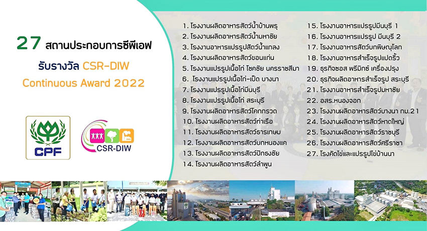 สำหรับ สถานประกอบการประเภทโรงงานของซีพีเอฟ 27 แห่ง ที่ได้รับรางวัล CSR-DIW Continuous Award 2022 ได้แก่ โรงงานผลิตอาหารสัตว์น้ำบ้านพรุ, โรงงานผลิตอาหารสัตว์น้ำมหาชัย, โรงงานอาหารแปรรูปสัตว์น้ำแกลง, โรงงานผลิตอาหารสัตว์ขอนแก่น, โรงงานแปรรูปเนื้อไก่โชคชัย นครราชสีมา, โรงงานแปรรูปเนื้อไก่-เป็ด บางนา, โรงงานแปรรูปเนื้อไก่มีนบุรี, โรงงานแปรรูปเนื้อไก่ สระบุรี, โรงงานผลิตอาหารสัตว์โคกกรวด, โรงงานผลิตอาหารสัตว์ท่าเรือ, โรงงานผลิตอาหารสัตว์ธารเกษม, โรงงานผลิตอาหารสัตว์บกหนองแค, โรงงานผลิตอาหารสัตว์ปักธงชัย, โรงงานผลิตอาหารสัตว์ลำพูน, โรงงานอาหารแปรรูปมีนบุรี 1, โรงงานอาหารแปรรูป มีนบุรี 2, โรงงานอาหารสัตว์บกพิษณุโลก, โรงงานอาหารสำเร็จรูปแปดริ้ว, ธุรกิจซอส พรีมิกซ์ เครื่องปรุง, ธุรกิจผลิตอาหารสำเร็จรูป สระบุรี, โรงงานอาหารสำเร็จรูปมหาชัย, อสร.หนองจอก, โรงงานผลิตอาหารสัตว์บางนา กม. 21, โรงงานผลิตอาหารสัตว์หาดใหญ่, โรงงานผลิตอาหารสัตว์ราชบุรี, โรงงานผลิตอาหารสัตว์ศรีราชา และโรงคัดไข่และแปรรูปไข่บ้านนา