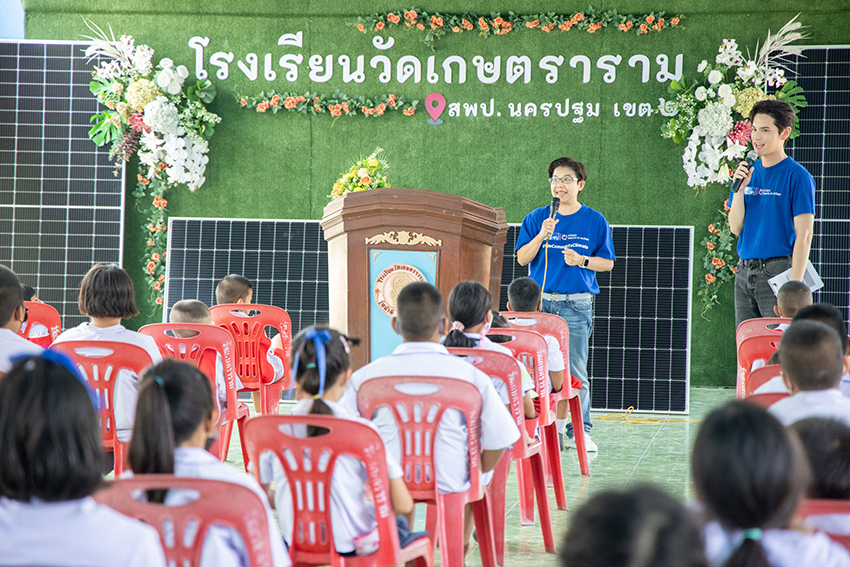 ร่วมกันมอบแผงโซล่าเซลล์ให้แก่โรงเรียนเกษตราราม จ.นครปฐม ภายใต้กิจกรรม “Live Green Save Green” นำโดย คุณบุปผาวดี โอวรารินท์ ประธานเจ้าหน้าที่บริหาร ฝ่ายทรัพยากรบุคคลและภาพลักษณ์องค์กร และการสื่อสารองค์กร (แถวหลัง คนที่ 3 จากซ้าย) ตัวแทนจากกรมพัฒนาพลังงานทดแทน และอนุรักษ์พลังงาน (แถวหลัง คนที่ 2 จากขวา) และคุณเต๋า เศรษฐพงศ์ เพียงพอ (แถวหลัง คนขวาสุด) ร่วมกันมอบแผงโซล่าเซลล์ให้กับโรงเรียน