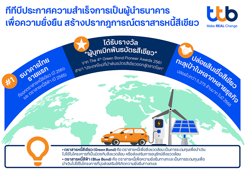 ทั้งนี้ ทีเอ็มบีธนชาตได้ออกตราสารหนี้สีเขียวครั้งแรกในปี 2561 มูลค่า 60 ล้านดอลลาร์สหรัฐฯ หรือประมาณ 1,850 ล้านบาท เพื่อนำเงินไปสนับสนุนการลงทุนของภาคเอกชนในโครงการที่เท่าทันต่อสภาพภูมิอากาศ (Climate-smart Project) และส่งเสริมการพัฒนาที่ยั่งยืน ทำให้ได้รับรางวัล “ผู้บุกเบิกพันธบัตรสีเขียว” สาขา “ประเทศใหม่ที่นำพันธบัตรสีเขียวออกสู่ตลาดโลก” จาก The 4th Green Bond Pioneer Awards สะท้อนความมุ่งมั่นของธนาคารที่ดำเนินธุรกิจเพื่อการเติบโตอย่างยั่งยืน และออกตราสารหนี้สีฟ้าเมื่อเดือนตุลาคม 2565 เพื่อระดมทุนมูลค่า 50 ล้านดอลลาร์สหรัฐฯ หรือ ประมาณ 1,700 ล้านบาท สำหรับโครงการที่เป็นประโยชน์กับสิ่งแวดล้อมและทรัพยากรทางทะเลโดยเฉพาะ