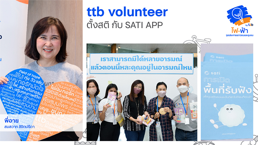 นางสมสวาท ลิขิตปรีดา หรือพี่อาย อาสาสมัครทีทีบี โครงการ “ตั้งสติ กับ SATI APP” โครงการที่เข้ามาช่วยต่อยอดแอปพลิเคชันที่ช่วยเหลือสังคม แอปพลิเคชันที่ช่วยเหมือนสายด่วนคอยรับฟังเรื่องราวและปัญหาของผู้ที่ประสบปัญหาความเครียด โดยทีมอาสาได้เข้ามาช่วยเหลือเรื่องการจัดการบริหารเงินทุน โดยนำเสนอไอเดียการทำ e-Learning คอร์สเพื่อวัดระดับเกี่ยวกับสุขภาพจิตที่จะสร้างรายได้ในระยะยาว ทำให้แอปพลิเคชันสามารถดำเนินการต่อไปได้