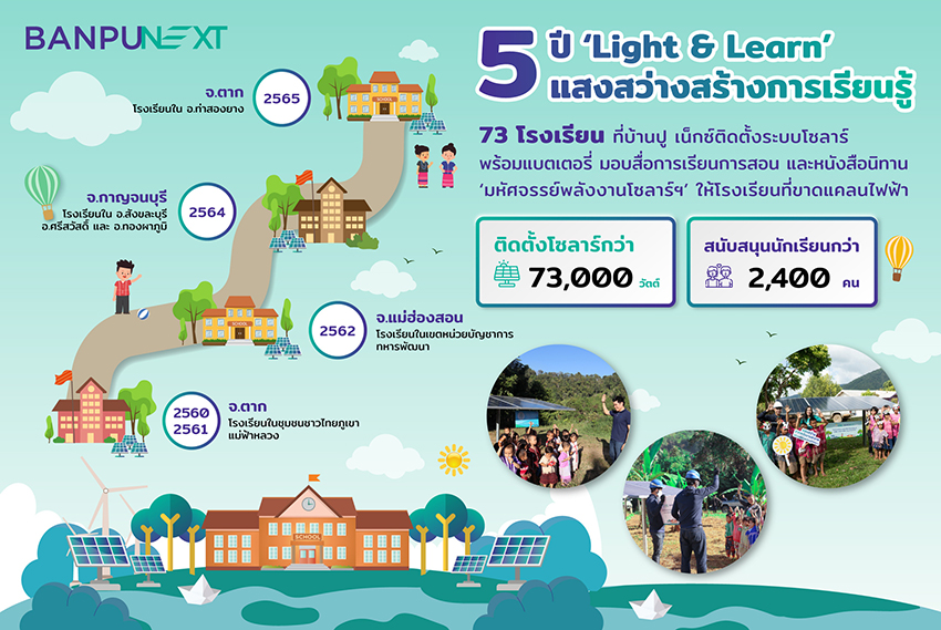 นายสินนท์ ว่องกุศลกิจ ประธานเจ้าหน้าที่บริหาร บริษัท บ้านปู เน็กซ์ จำกัด กล่าวว่า “ตลอด 5 ปีที่บ้านปู เน็กซ์ดำเนินโครงการพลังงานแสงอาทิตย์เพื่อการเรียนรู้ Light & Learn เรานำระบบโซลาร์ไปติดตั้งให้แก่โรงเรียนในพื้นที่ห่างไกลและไม่มีไฟฟ้าใช้ โดยเชื่อว่าแสงสว่างจะเป็นอีกหนึ่งพลังที่ช่วยยกระดับการเรียนการสอน พร้อมสร้างประโยชน์รอบด้านให้เยาวชนไทย และคุณครูอย่างยั่งยืน ไม่ว่าจะเป็น 1.ด้านการเรียนรู้ ช่วยเปิดประสบการณ์ใหม่ ๆ ให้เด็ก ๆ ได้พัฒนาการใช้ภาษาไทย และความคิดสร้างสรรค์ 2. ด้านการสอน สนับสนุนให้คุณครูใช้สื่อการสอนที่หลากหลาย และทันต่อโลกยุคใหม่ 3. ด้านคุณภาพชีวิต อำนวยความสะดวกในการดำรงชีวิต 4. ด้านสิ่งแวดล้อม ได้ใช้ไฟฟ้าจากพลังงานสะอาด 100% ซึ่งเด็ก ๆ จะถูกปลูกฝังเรื่องพลังงานสะอาดผ่านการใช้และร่วมกันดูแลรักษา 5.ด้านจิตใจ เติมเต็มความสุข สร้างรอยยิ้ม และความฝันให้เด็ก ๆ จากการเรียนรู้ผ่านสื่อการสอนที่หลากหลาย”