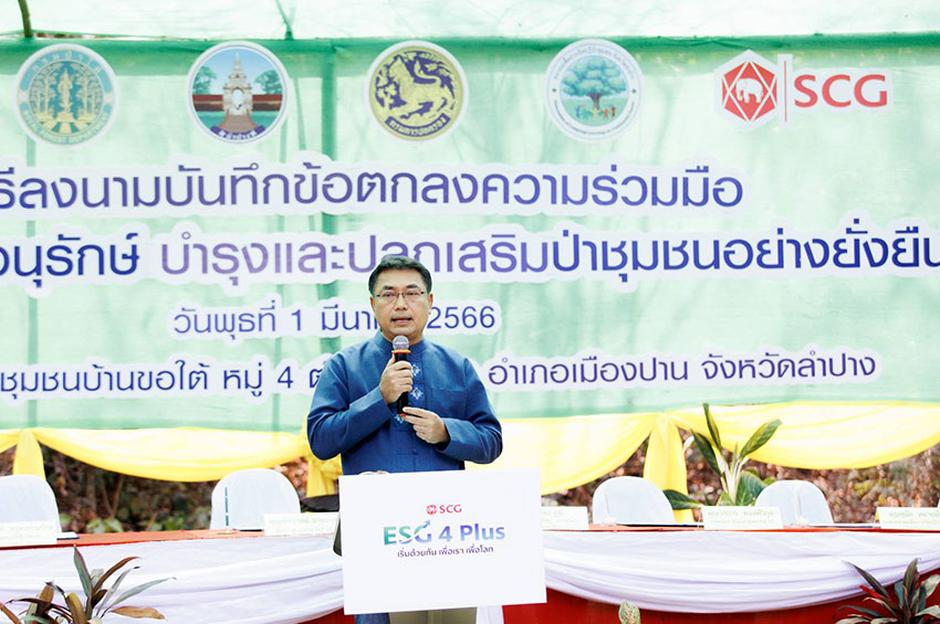 นายชนะ ภูมี ผู้ช่วยผู้จัดการใหญ่-การบริหารความยั่งยืน เอสซีจี นายวรการ พงษ์ศิริกุล Cement Plant Director บริษัท ปูนซิเมนต์ไทย (ลำปาง) จำกัด นายชัชวาลย์ ฉายะบุตร ผู้ว่าราชการจังหวัดลำปาง พร้อมด้วยนายอนุชาติ สุปัญญา ผู้อำนวยการส่วนจัดการป่าชุมชน สำนักจัดการทรัพยากรป่าไม้ที่ 3 (ลำปาง) ร่วมกับเครือข่ายพันธมิตรจังหวัดลำปาง สมาคมเพื่อการเรียนรู้ป่าชุมชน จ.ลำปาง และคณะกรรมการจัดการป่าชุมชน 5 พื้นที่ ได้แก่ ป่าชุมชนบ้านหาดปู่ด้าย, ป่าชุมชนบ้านขอใต้, ป่าชุมชนบ้านแม่เชียงรายลุ่ม, ป่าชุมชนบ้านร่องเคาะและป่าชุมชนบ้านสบลืน ได้ร่วมมือทำบันทึกข้อตกลงอนุรักษ์ บำรุง และปลูกเสริมป่าชุมชนอย่างยั่งยืนบนพื้นที่ป่าชุมชนจำนวน 3,000 ไร่ ณ ชุมชนบ้านขอใต้ จังหวัดลำปาง