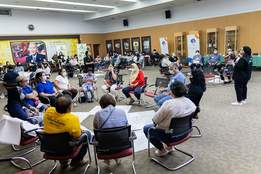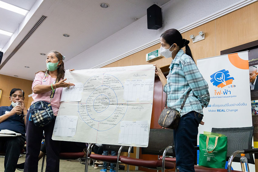 ด้านตัวแทนจากชุมชนบ้านมั่นคงใจเดียวกัน เขตบางพลัด กรุงเทพฯ ที่เกิดจากการรวมตัวกันของ 5 ชุมชนที่มีปัญหาที่พักอาศัย มีสมาชิก 37 ครัวเรือน เล่าว่า สมาชิกส่วนใหญ่ทำอาชีพรับจ้างและค้าขาย ในช่วงสถานการณ์โควิด-19 หลายครัวเรือนขาดรายได้ จึงร่วมกันปลูกผักสวนครัวในชุมชนเพื่อลดค่าใช้จ่าย และเพิ่มรายได้เล็กน้อย ซึ่งเมื่อมูลนิธิทีทีบีเข้ามาได้ช่วยพัฒนาขยายผลไปสู่การสร้างโรงเพาะเห็ดในชุมชน โดยจัดกิจกรรมเรียนรู้การเพาะเห็ดกับผู้มีความรู้และเชี่ยวชาญ ตั้งแต่กระบวนการเริ่มเพาะเห็ด การแปรรูปเห็ด ไปจนถึงการกำจัดถุงหัวเชื้อเห็ดที่ใช้แล้วอย่างไรไม่ให้เกิดมลพิษ นอกจากนี้ ยังให้ความรู้เรื่องการทำบัญชี ที่สำคัญการมีกิจกรรมร่วมกันทำให้ชุมชนเกิดความสัมพันธ์อันดีและมีรายได้เสริม ซึ่งรายได้ส่วนหนึ่งจากการขายผลิตภัณฑ์ จะนำมาเป็นเงินกองทุนสำหรับช่วยเหลือดูแลคนในชุมชน เกิดเป็นชุมชนเข้มแข็งที่พึ่งพาตัวเองได้”