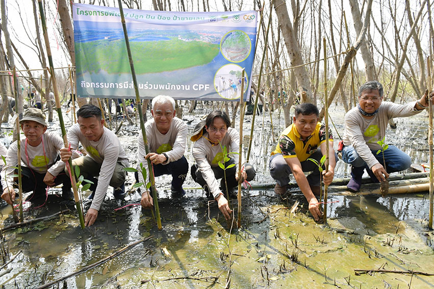 ซีพีเอฟ มุ่งมั่นดำเนินธุรกิจด้วยความรับผิดชอบต่อสังคมและสิ่งแวดล้อม ภายใต้กลยุทธ์ 3 เสาหลักสู่ความยั่งยืน "อาหารมั่นคง สังคมพึ่งตน และดิน น้ำ ป่าคงอยู่" เพื่อสร้างความมั่นคงทางอาหาร (Food Security) ทั้งในภาวะปกติและในสถานการณ์วิกฤต โดยเฉพาะอย่างยิ่ง ภายใต้ความท้าทายจากผลกระทบของการเปลี่ยนแปลงสภาพภูมิอากาศ (Climate Change) บริษัทฯตระหนักถึงการมีส่วนร่วมเพิ่มพื้นที่ป่าต้นน้ำ ป่าชายเลน และการปลูกต้นไม้ในสถานประกอบการ ซึ่งในการดำเนินโครงการ "ซีพีเอฟ ปลูก ปัน ป้อง ป่าชายเลน" ตั้งแต่ปี 2557- 2561 อนุรักษ์และฟื้นฟูป่าชายเลน รวม 2,400 ไร่ ปัจจุบันเข้าสู่ระยะที่สองของโครงการ (ปี 2562-2566) มีเป้าหมายอนุรักษ์ ฟื้นฟูและปลูกป่าใหม่ อีก 2,800 ไร่ ในพื้นที่ยุทธศาสตร์ จ.สมุทรสาคร ระยอง และตราด