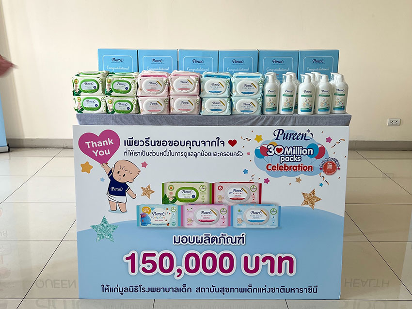เดินหน้าฉลองยอดขาย “เพียวรีน เบบี้ ไวพส์” ครบ 30 ล้านแพ็ก จัดแคมเปญ “Puree 30 Million Packs Celebration” เพื่อแทนคำขอบคุณและคืนกำไรสู่สังคม ด้วยการส่งมอบผลิตภัณฑ์เพียวรีน มูลค่า 150,000 บาท สำหรับดูแลสุขภาพผู้ป่วยเด็ก และบุคลากร ของสถาบัน สุขภาพเด็กแห่งชาติมหาราชินี
