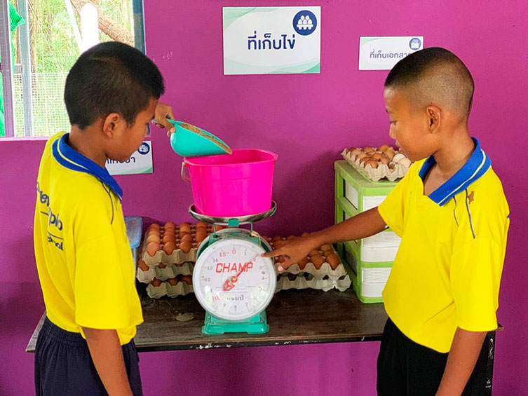 สำหรับกระบวนการเลี้ยงไก่ไข่ของที่นี่ เริ่มจากช่วงเช้าเด็กๆชั้น ป.4-ป.6 ที่รับผิดชอบในแต่ละวัน 3-5 คน จะเข้ามาเกลี่ยอาหารเก่าในรางอาหารก่อน หลังจาก 15.30 น. นักเรียนจะช่วยกันเกลี่ยอาหารและทำความสะอาดราง เพื่อให้อาหารรอบใหม่ จากนั้นจะเก็บไข่ นำส่งร้านค้าสหกรณ์โรงเรียน เพื่อจำหน่ายเข้าโครงการอาหารเช้าและอาหารกลางวัน สำหรับปรุงเป็นเมนูไข่สัปดาห์ละ 3 วัน เมนูที่เด็กๆชอบคือ ไข่ลูกเขย ไข่พะโล้ และไข่น้ำ ส่วนผลผลิตไข่ที่เหลือจะนำไปจำหน่ายแก่ครู ผู้ปกครอง และคนในชุมชน ผอ.อลิสา บอกว่า สิ่งที่ครูภูมิใจที่สุดคือ การที่พวกเขามีความรับผิดชอบ รู้หน้าที่และทำงานตามตารางที่กำหนด เวลาที่ได้มาเลี้ยงไก่ไข่สีหน้าของพวกเขามีความสุข ที่ได้ดูแลไก่ ได้เก็บไข่ ที่สำคัญนักเรียนยังมีส่วนร่วมระดมความคิดในการจัดการเลี้ยงด้วย