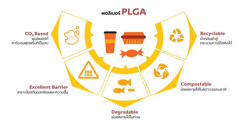 ซึ่งล่าสุด SCGC ได้ร่วมกับ Avantium พัฒนาพอลิเมอร์ PLGA (polylactic-co-glycolic acid: PLGA) หรือ พอลิเมอร์คาร์บอนฟุตพริ้นท์เป็นลบ (carbon-negative plastic) โดยนำเอาก๊าซคาร์บอนไดออกไซด์มาใช้เป็นสารตั้งต้น รวมทั้งไม่ปล่อยก๊าซคาร์บอนฯ ในกระบวนการผลิต นอกจากนี้ ยังพบว่า พอลิเมอร์ PLGA ซึ่งมีส่วนผสมของกรดแลคติกและไกลโคลิค นอกจากจะมีประสิทธิภาพที่ดีมีคุณสมบัติพิเศษในการป้องกันออกซิเจน ความชื้น และรีไซเคิลได้นั้น ยังสามารถย่อยสลายได้ทั้งในสภาวะธรรมชาติ และในทะเลอีกด้วย ซึ่งตอบโจทย์ทั้งภาคอุตสาหกรรมและการดูแลสิ่งแวดล้อมอย่างยั่งยืน”