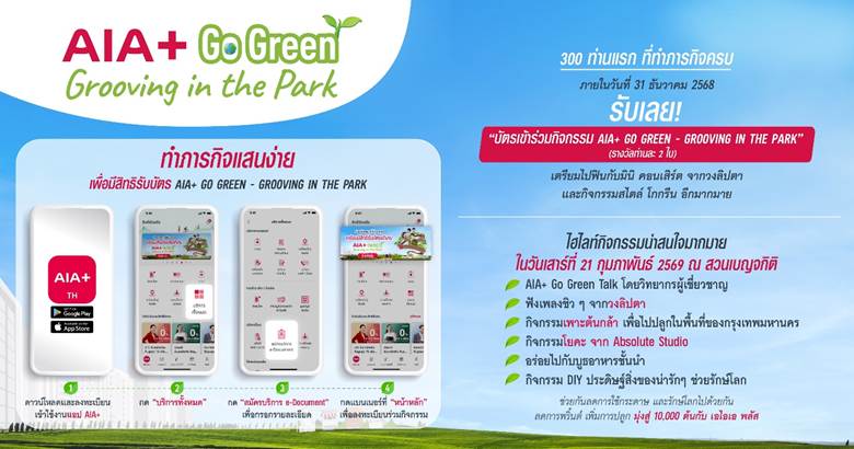 ร่วมเป็นส่วนหนึ่งของแคมเปญ AIA+ Go Green เพื่อร่วมกันรักษ์โลกและสร้างความยั่งยืนไปกับ เอไอเอ โดยการเปลี่ยนสู่ธุรกรรมอิเล็กทรอนิกส์ที่สะดวกและปลอดภัย เพียงดาวน์โหลดแอป AIA+ และสมัครรับบริการ E-Document และ E-Receipt ได้ตั้งแต่วันที่ 14 ตุลาคม – 31 ธันวาคม 2568 เพื่อมีสิทธิรับบัตร AIA+ Go Green - Grooving in the Park ในวันเสาร์ที่ 21 กุมภาพันธ์ 2569