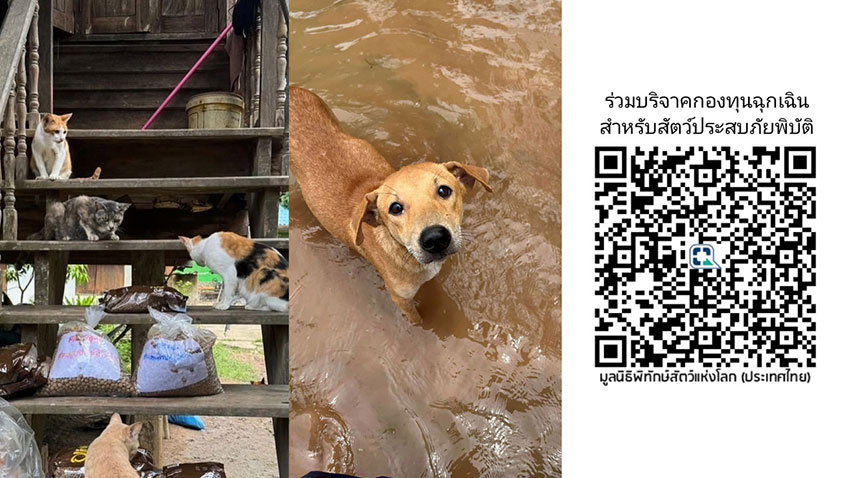 ขณะนี้ สถานการณ์น้ำท่วมยังไม่คลี่คลาย กำลังขยายวงกว้างสู่ภาคเหนือ ภาคตะวันออกเฉียงเหนือ และอาจลุกลามถึงภาคกลางของประเทศไทย สัตว์เลี้ยงและสัตว์จรจัดอีกนับพันชีวิตตกอยู่ในความเสี่ยง และกำลังรอความช่วยเหลือจากผู้มีจิตเมตตา เงินบริจาคของคุณจะถูกนำไปใช้ เพื่อเร่งจัดหาและกระจายอาหารสุนัขและแมวในพื้นที่วิกฤตโดยเร็วที่สุด พร้อมส่งต่อความช่วยเหลือด้านการรักษาพยาบาลสัตว์ที่เจ็บป่วย และจัดหาที่พักพิงชั่วคราวให้กับสัตว์จำนวนมาก