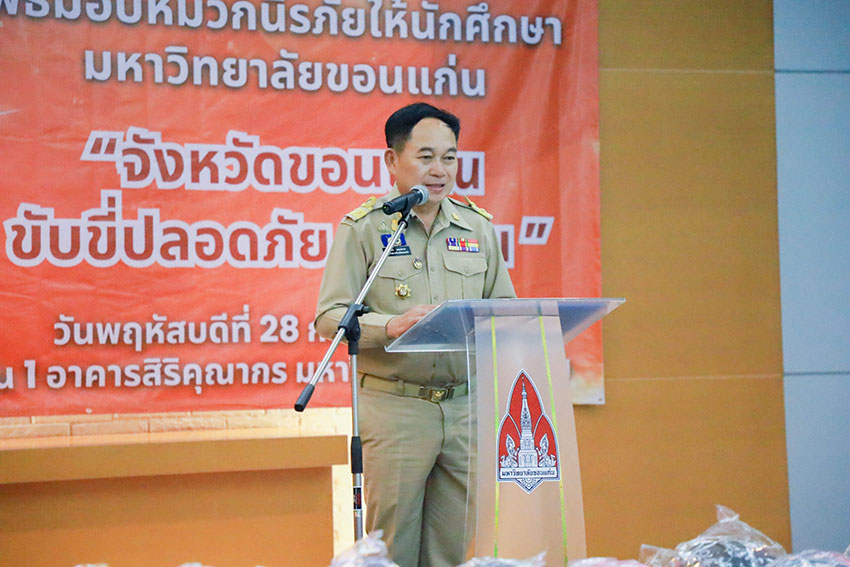 มหาวิทยาลัยขอนแก่น ร่วมกับจังหวัดขอนแก่น จัดพิธีมอบหมวกนิรภัยให้นักศึกษามหาวิทยาลัยขอนแก่น การดำเนินงาน “จังหวัดขอนแก่นขับขี่ปลอดภัย 365 วัน” บริเวณโถง ชั้น 1 อาคารสิริคุณากร มหาวิทยาลัยขอนแก่น
