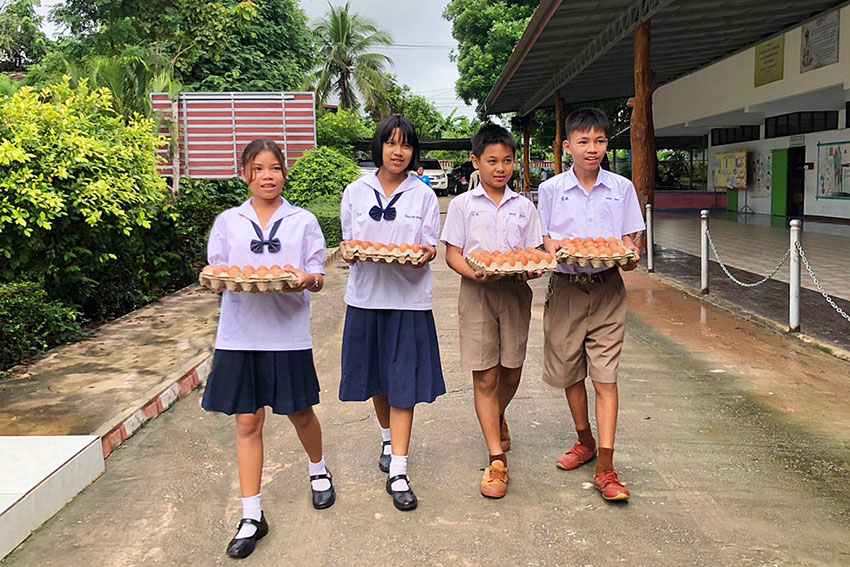 สำหรับกิจกรรมในแต่ละวัน ครูแหม่มบอกว่า จะมีเด็กนักเรียนชั้นประถม 4-5-6 จัดเวรเข้ามาดูแลไก่ โดยมีพี่ประถม 6 เป็นหลัก 1-2 คน และน้องๆ ประถม 4-5 มาช่วยอีก 2 คน โดยนักเรียนทั้ง 3 ชั้นปี ทุกคนจะได้มีโอกาสหมุนเวียนเข้ามารับผิดชอบ เพื่อให้พวกเขาได้ฝึกความรับผิดชอบ เรียนรู้การมีส่วนร่วมทำงานเป็นทีม และเป็นการปูพื้นฐานด้านเศรษฐกิจพอเพียง น้องๆยังได้เรียนรู้เรื่องโภชนาการควบคู่ไปด้วย ที่สำคัญยังได้รู้ว่าอาหารที่รับประทานทุกวันมีแหล่งที่มาอย่างไร มีความปลอดภัยในอาหารจากฝีมือการเลี้ยงของพวกเขา นอกจากนี้ ยังได้ฝึกเรื่องบัญชีและการออม จากการทำบันทึกจำนวนไข่ไก่และการขายไข่ไก่เข้าโครงการอาหารกลางวัน ซึ่งปัจจุบันมีเงินทุนหมุนเวียนในโครงการเลี้ยงไก่ไข่ฯถึง 2 แสนกว่าบาทแล้ว