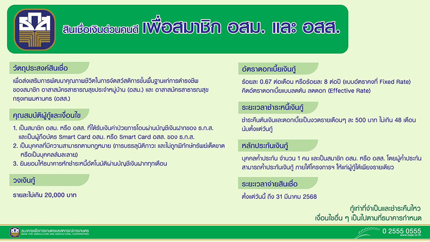 สำหรับเงื่อนไขผู้กู้ต้องเป็นสมาชิก อสม. และ อสส. ที่ถือบัตร Smart card ของ ธ.ก.ส. รวมถึงเป็นบุคคลที่มีความสามารถตามกฎหมาย มีสมาชิก อสม. และ อสส. เป็นผู้ค้ำประกัน (ค้ำได้คราวละ 1 คน) สมาชิกที่สนใจสามารถแจ้งความประสงค์ได้ที่ ธ.ก.ส. ทุกสาขาทั่วประเทศ ตั้งแต่วันนี้จนถึง 31 มีนาคม 2568 สอบถามข้อมูลเพิ่มเติมได้ที่ Call Center 02 555 0555 หรือ Facebook ธกส BAAC Thailand