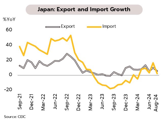 BOJ คงดอกเบี้ยที่ 0.25% รอจังหวะการปรับขึ้นหากเศรษฐกิจและเงินเฟ้อเป็นไปตามคาด ธนาคารกลางญี่ปุ่น (BOJ) ตัดสินใจคงอัตราดอกเบี้ยนโยบายที่ 0.25% ตามคาดในการประชุมวันที่ 19 กันยายน และมีมุมมองที่เป็นบวกมากขึ้นต่อการบริโภคในประเทศแม้ความเสี่ยงภายนอกยังสูง จากตัวเลขเศรษฐกิจล่าสุดในเดือนสิงหาคม ยอดส่งออกเติบโต 5.6% YoY ชะลอลงจากเดือนก่อนหน้าที่โต 10.2% ขณะที่ยอดนำเข้าชะลอลงจาก 16.6% สู่ระดับ 2.3% ส่วนอัตราเงินเฟ้อทั่วไปเพิ่มขึ้นสู่ 3.0% จากเดือนก่อนหน้าที่ 2.8% ส่วนอัตราเงินเฟ้อพื้นฐานขยับขึ้นสู่ 2.8% จาก 2.7%