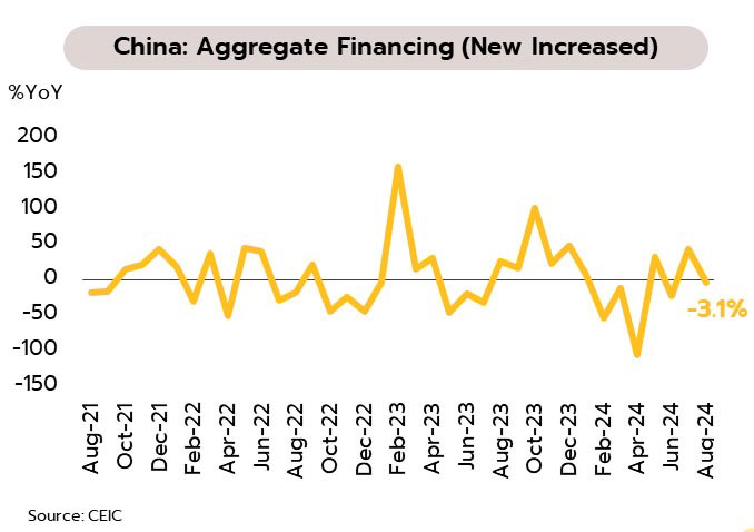 ยอดสินเชื่อใหม่ที่หดตัวบ่งชี้ถึงความเสี่ยงที่กิจกรรมทางเศรษฐกิจของจีนอาจชะลอตัวรุนแรงขึ้นในระยะข้างหน้า ขณะที่การบริโภคภายในประเทศที่อ่อนแอและความซบเซาในภาคอสังหาริมทรัพย์ยังกดดันเศรษฐกิจต่อเนื่อง ข้อมูลดังกล่าวสะท้อนความจำเป็นในการเร่งออกมาตรการกระตุ้นเพิ่มเติมเพื่อให้เศรษฐกิจสามารถขยายตัวได้ใกล้เคียงกับเป้าหมายที่ราว 5% วิจัยกรุงศรีประเมินว่าการลดอัตราดอกเบี้ยนโยบายของสหรัฐฯ รวมถึงการแข็งค่าของเงินหยวนเปิดทางให้จีนสามารถผ่อนคลายนโยบายการเงินเพิ่มเติมได้ โดยอาจมีการปรับลดอัตราดอกเบี้ยนโยบาย 0.10-0.20% ในช่วงไตรมาสที่ 4 ส่วนมาตรการด้านอสังหาริมทรัพย์อาจช่วยบรรเทาความซบเซาได้บ้าง แต่คาดว่ายอดขายบ้านใหม่จะยังคงหดตัวต่อ และราคาบ้านจะยังไม่ได้ผ่านจุดต่ำสุดในช่วงที่เหลือของปี