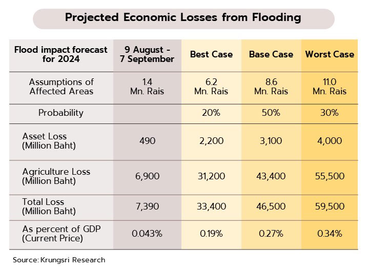 ล่าสุดวิจัยกรุงศรียังคงประมาณการอัตราการเติบโตของ GDP ในปี 2567 ไว้ที่ 2.4% แม้ว่าเศรษฐกิจไทยในช่วงไตรมาสสุดท้ายของปีจะได้รับแรงสนับสนุนจากโครงการกระตุ้นเศรษฐกิจผ่านกลุ่มเปราะบาง ซึ่งจะช่วยเพิ่มกำลังซื้อและกระตุ้นการใช้จ่ายภายในประเทศ แต่ผลบวกดังกล่าวอาจถูกลดทอนด้วยผลกระทบจากสถานการณ์อุทกภัยที่สร้างความเสียหายในหลายพื้นที่ทั่วประเทศ เบื้องต้นจากการคาดการณ์ในกรณีฐาน (Base Case) วิจัยกรุงศรีคาดว่า พื้นที่ที่ได้รับผลกระทบจากน้ำท่วมจะอยู่ที่ประมาณ 8.6 ล้านไร่ ซึ่งจะก่อให้เกิดความเสียหายทางทรัพย์สินมูลค่าประมาณ 3.1 พันล้านบาท และผลผลิตทางการเกษตรเสียหายมูลค่ารวม 43.4 พันล้านบาท เมื่อรวมความเสียหายทั้งหมด คาดว่าจะอยู่ที่ประมาณ 46.5 พันล้านบาท หรือคิดเป็นประมาณ -0.27% ของ GDP