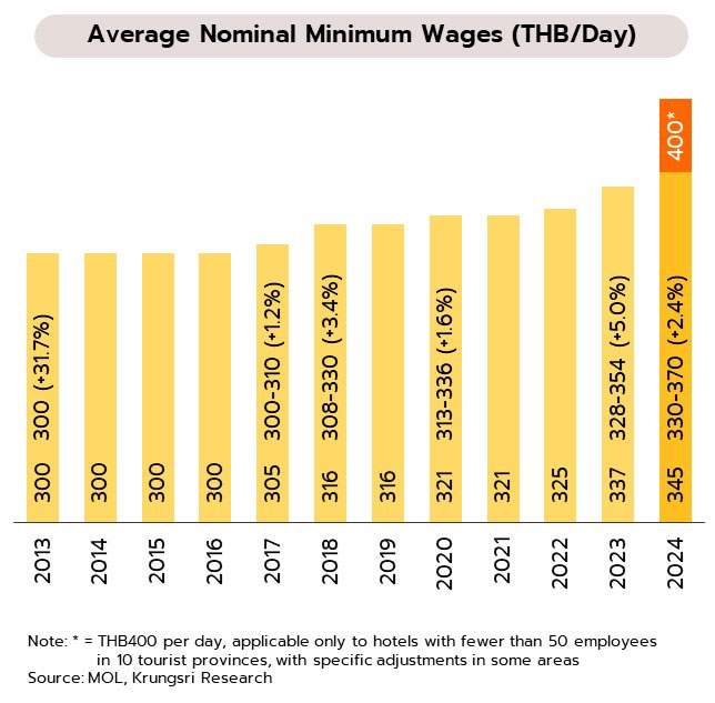 ปัจจุบันแรงงานที่ได้ค่าจ้างน้อยกว่าค่าจ้างขั้นต่ำมีสัดส่วนอยู่เพียง 16% ของแรงงานทั้งหมด เทียบกับ 38.8% ในปี 2557 อย่างไรก็ตาม ยังมีธุรกิจที่มีการขยายตัวของผลิตภาพแรงงานในปัจจุบันต่ำกว่าการเติบโตของค่าจ้างที่แท้จริง (Negative productivity-wage gap) อาจเผชิญแรงกดดันมากขึ้นต่อผลกำไรและความสามารถในการแข่งขัน เนื่องจากต้นทุนแรงงานที่สูงขึ้นอาจไม่สอดคล้องกับการเพิ่มขึ้นของผลิตภาพแรงงาน โดยกลุ่มธุรกิจที่มีความเสี่ยงมากขึ้นจากการปรับขึ้นค่าจ้าง ได้แก่ สิ่งทอและเครื่องนุ่งห่ม อิเล็กทรอนิกส์ ยางและพลาสติก อาหารและเครื่องดื่ม และยานยนต์และอุปกรณ์ขนส่ง รวมถึงธุรกิจอสังหาริมทรัพย์ ขณะที่ธุรกิจบริการอื่นๆ ส่วนใหญ่มีช่องว่างผลิตภาพแรงงานและค่าจ้างเป็นบวก อาทิ การเงิน และการค้า ซึ่งสะท้อนว่าผลกระทบจากการปรับขึ้นค่าจ้างขั้นต่ำต่อธุรกิจโดยภาพรวมอาจจำกัด