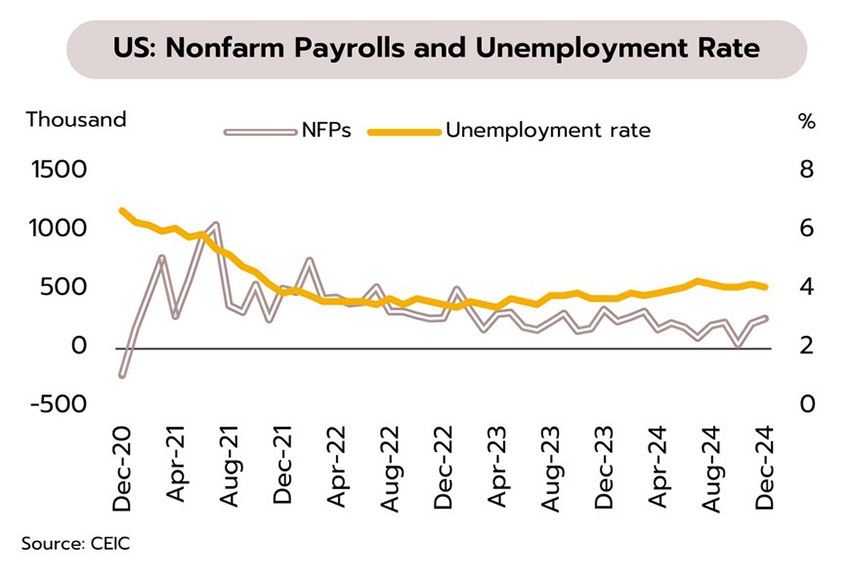 แม้ตัวเลขเศรษฐกิจและการจ้างงานยังแข็งแกร่ง แต่สหรัฐฯ ยังมีความเสี่ยงขาลงจากผลของดอกเบี้ยที่สูงและความไม่แน่นอนจากนโยบายทรัมป์ ในเดือนธันวาคม การจ้างงานนอกภาคเกษตรเพิ่มขึ้นจาก 212,000 ตำแหน่ง ในเดือนพฤศจิกายน สู่ 256,000 ตำแหน่ง ส่วนอัตราการว่างงานปรับลดลงจาก 4.2% สู่ระดับ 4.1% สอดคล้องกับตัวเลขเปิดรับสมัครงานที่ปรับเพิ่มขึ้นสู่ระดับ 8.09 ล้านตำแหน่ง มากสุดในรอบ 5 เดือน สะท้อนภาพรวมตลาดแรงงานที่ยังคงแข็งแกร่ง ขณะที่ดัชนี ISM ภาคบริการขยับเพิ่มขึ้นมากกว่าคาดจาก 52.1 มาอยู่ที่ 54.1 อย่างไรก็ตาม ดัชนีความเชื่อมั่นผู้บริโภคลดลงจาก 74 ในเดือนธันวาคม สู่ระดับ 73.2 ในเดือนมกราคม
