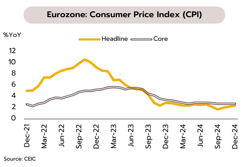 เศรษฐกิจยูโรโซนยังเผชิญความท้าทายจากต้นทุนพลังงานที่สูง รวมถึงความเสี่ยงทางการเมืองในเยอรมนีและฝรั่งเศส ในเดือนธันวาคม ดัชนี PMI ภาคบริการกลับมาขยายตัวโดยเพิ่มขึ้นจากในเดือนพฤศจิกายน 49.5 สู่ระดับ 51.6 อย่างไรก็ตาม ดัชนี PMI ภาคการผลิตยังคงหดตัวต่อเนื่องเป็นเดือนที่ 3 อยู่ที่ 45.1 ซึ่งเป็นระดับต่ำสุดในรอบ 3 เดือน ขณะที่อัตราเงินเฟ้อทั่วไปขยับเพิ่มขึ้นจาก 2.2% สู่ระดับ 2.4% YoY ส่วนอัตราเงินเฟ้อพื้นฐานทรงตัวที่ 2.4% สะท้อนถึงแรงกดดันเงินเฟ้อที่ขยับขึ้น นอกจากนี้ ยูเครนประกาศยุติสัญญาการส่งก๊าซธรรมชาติจากรัสเซียไปยังยุโรปซึ่งหมดอายุลงเมื่อสิ้นปีที่ผ่านมา