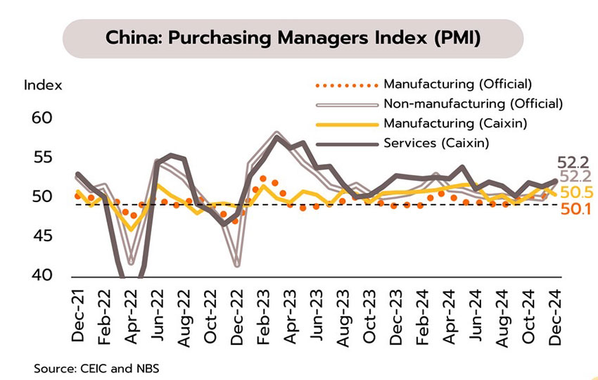 มาตรการกระตุ้นรอบใหม่มีแนวโน้มช่วยพยุงเศรษฐกิจจีน ขณะที่จีนยังคงเผชิญแรงกดดันจากปัจจัยเสี่ยงทั้งภายในและภายนอก ทางการและภาคเอกชน (Caixin) รายงาน PMI ภาคการผลิตขยายตัวชะลอลงในเดือนธันวาคม ขณะที่ดัชนีคำสั่งซื้อใหม่ขยายตัวต่อเนื่องส่วน PMI นอกภาคการผลิตขยายตัวเร่งขึ้น ด้านอัตราเงินเฟ้อทั่วไปเดือนธันวาคมยังอยู่ในระดับต่ำต่อเนื่องที่ 0.1% YoY ซึ่งต่ำสุดในรอบ 9 เดือน ส่วนดัชนีราคาผู้ผลิตดีขึ้นเล็กน้อยจาก -2.5% เป็น -2.3% สำหรับภาคอสังหาริมทรัพย์ ยอดขายบ้านใหม่ของผู้พัฒนาอสังหาฯ 100 อันดับแรกเริ่มทรงตัวที่ 0% YoY ในเดือนธันวาคมจาก -6.9% ในเดือนพฤศจิกายน