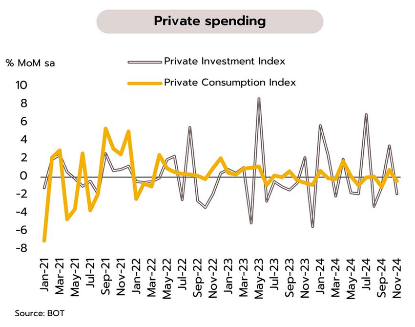 การใช้จ่ายในประเทศในช่วงปลายปีที่ผ่านมาแผ่วลงอย่างชัดเจนสะท้อนถึงการทยอยหมดลงของผลบวกจากมาตรการการโอนเงิน 10,000 บาทแก่กลุ่มเปราะบางราว 14 ล้านคน ซึ่งได้เริ่มดำเนินการตั้งแต่ปลายเดือนกันยายน 2567 เป็นต้นไป สำหรับในช่วงไตรมาสแรกของปีนี้ทางการออกมาตรการกระตุ้นการใช้จ่ายผ่านการลดหย่อนภาษีเงินได้บุคคลธรรมดาในโครงการ Easy-E-Receipt (ใช้จ่ายสูงสุดไม่เกิน 50,000 บาทต่อราย) เริ่มมีผลบังคับใช้วันที่ 16 มกราคม ถึงวันที่ 28 กุมภาพันธ์ และมาตรการโอนเงิน 10,000 บาทแก่กลุ่มผู้สูงอายุที่ลงทะเบียนขอรับสิทธิ์จากแอพพลิเคชั่นทางรัฐ (ประมาณ 4 ล้านคน) ตั้งเป้าโอนเงินให้ในช่วงปลายเดือนมกราคมนี้ มาตรการดังกล่าวคาดว่าจะเป็นปัจจัยบวกระยะสั้นๆ ต่อการบริโภคภาคเอกชน ท่ามกลางความเชื่อมั่นที่ยังฟื้นตัวช้า และหนี้ครัวเรือนที่อยู่ในระดับสูง ในปี 2568 วิจัยกรุงศรีคาดว่าการบริโภคภาคเอกชนมีแนวโน้มที่จะเติบโตชะลอลงเหลือ 3% จากปีก่อนที่ขยายตัวได้ราว 4.8%