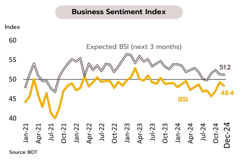การลงทุนยังเผชิญกับความเชื่อมั่นที่ฟื้นตัวช้า และความท้าทายจาก Global Minimum Tax ที่มีผลบังคับใช้เมื่อต้นปี ธปท.รายงานดัชนีความเชื่อมั่นทางธุรกิจเดือนธันวาคมกลับมาปรับตัวลดลงสู่ 48.4 จาก 49.3 ในเดือนพฤศจิกายน และยังอยู่ในระดับต่ำกว่า 50 (หดตัว) ต่อเนื่องเป็นเดือนที่ 15 ส่วนใหญ่เป็นผลจากความเชื่อมั่นในภาคการผลิตที่ปรับลดลงและอยู่ในแดนหดตัวตั้งแต่กลางปี 2567 ขณะที่ความเชื่อมั่นในภาคที่มิใช่การผลิตปรับดีขึ้นมาอยู่เหนือระดับ 50 ปัจจัยบวกจากการฟื้นตัวของภาคท่องเที่ยวเป็นสำคัญ