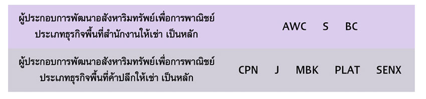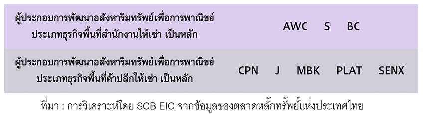 รูปที่ 1 : บริษัทจดทะเบียนในตลาดหลักทรัพย์แห่งประเทศไทย หมวดพัฒนาอสังหาริมทรัพย์ ที่ดำเนินธุรกิจพัฒนาอสังหาริมทรัพย์เพื่อการพาณิชย์ ประเภทธุรกิจพื้นที่สำนักงานให้เช่า และธุรกิจพื้นที่ค้าปลีกให้เช่า เป็นหลัก
