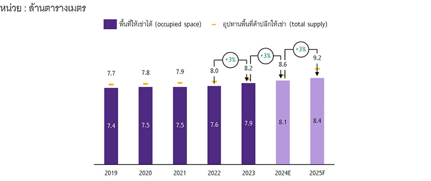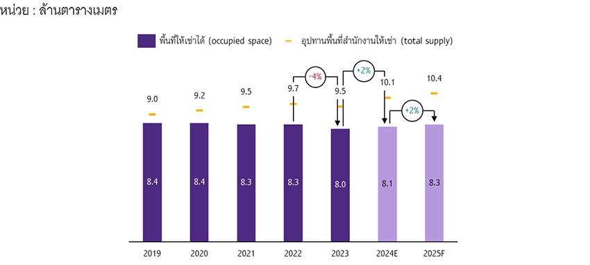 ธุรกิจพื้นที่สำนักงานให้เช่าในกรุงเทพฯ และปริมณฑลในปี 2024 และ 2025 ยังเผชิญแรงกดดันจากความต้องการพื้นที่เช่าที่ยังไม่สามารถฟื้นตัวได้เท่าที่ควร