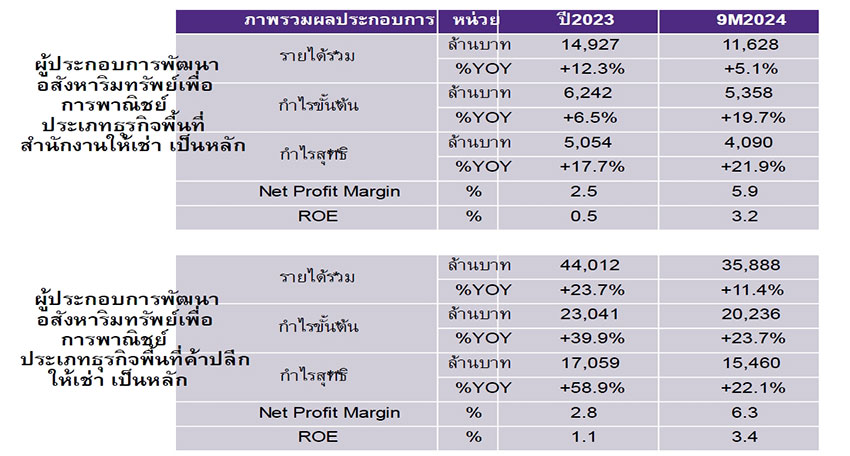 ภาพรวมผลประกอบการบริษัทจดทะเบียนในตลาดหลักทรัพย์แห่งประเทศไทย หมวดพัฒนาอสังหาริมทรัพย์ ที่ดำเนินธุรกิจพัฒนาอสังหาริมทรัพย์เพื่อการพาณิชย์ ประเภทธุรกิจพื้นที่สำนักงานให้เช่า และธุรกิจพื้นที่ค้าปลีกให้เช่า เป็นหลัก