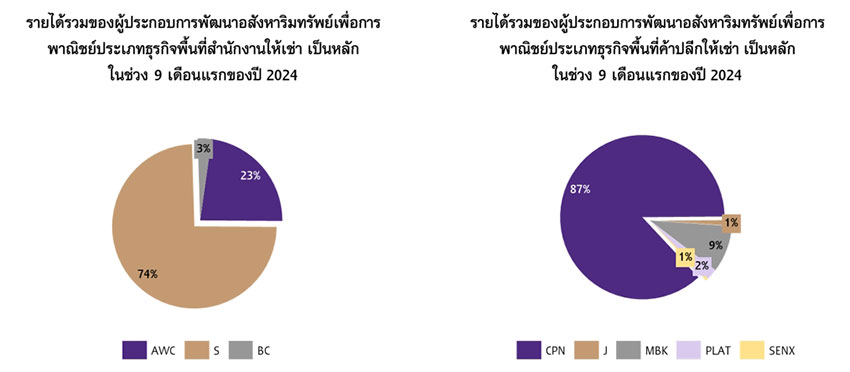 สัดส่วนรายได้รวมของบริษัทจดทะเบียนในตลาดหลักทรัพย์แห่งประเทศไทย หมวดพัฒนาอสังหาริมทรัพย์ ที่ดำเนินธุรกิจพัฒนาอสังหาริมทรัพย์เพื่อการพาณิชย์ ประเภทธุรกิจพื้นที่สำนักงานให้เช่า และธุรกิจพื้นที่ค้าปลีกให้เช่าเป็นหลัก ในช่วง 9 เดือนแรกของปี 2024