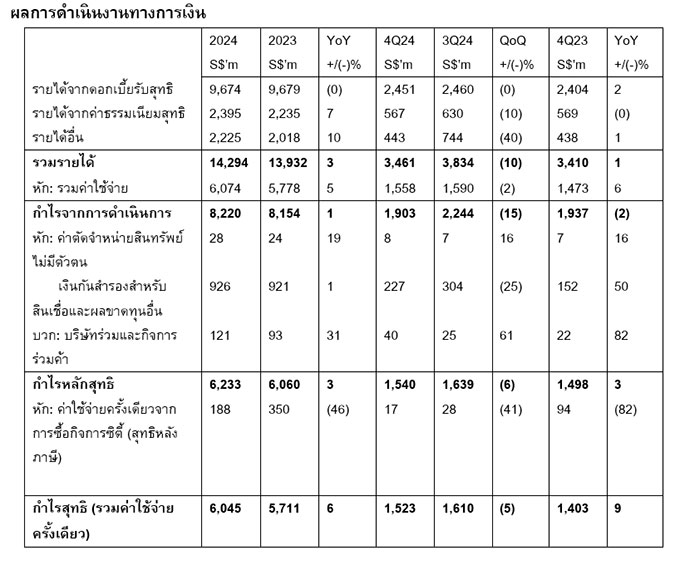 รายได้จากดอกเบี้ยรับสุทธิยังคงทรงตัวที่ระดับ 2.5 พันล้านเหรียญดอลลาร์สิงคโปร์ ส่วนต่างอัตราดอกเบี้ยสุทธิลดลงมาอยู่ที่ร้อยละ 2.00 จากอัตราดอกเบี้ยอ้างอิงที่ลดลง แต่ได้รับการชดเชยจากสินเชื่อที่เติบโตขึ้นร้อยละ 1 รายได้จากค่าธรรมเนียมสุทธิปรับตัวลดลงจากรายได้ระดับสูงในไตรมาสก่อน อยู่ที่ 567 ล้านเหรียญสิงคโปร์ เนื่องจากการชะลอตัวตามฤดูกาลในกิจกรรมที่เกี่ยวข้องกับสินเชื่อและการบริหารจัดการความมั่งคั่ง รายได้ที่ไม่ใช่ดอกเบี้ยกลับสู่ภาวะปกติที่ 443 ล้านเหรียญสิงคโปร์ หลังจากที่ในไตรมาส 3 ปี 2567 มีผลการดำเนินงานที่ได้รับอานิสงส์จากความผันผวนของตลาด